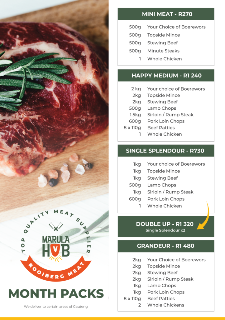 Nothing beats convenience when your meat is exactly cut and packaged to your liking. Marula Hub Butchery offers beef, pork, lamb, chicken, and venison. We produce a variety of popular items like our famous MARULA WORS, and “skilpadjies”. We also do game processing, including products like carpaccio, warthog salami and our very popular warthog cheese grillers.